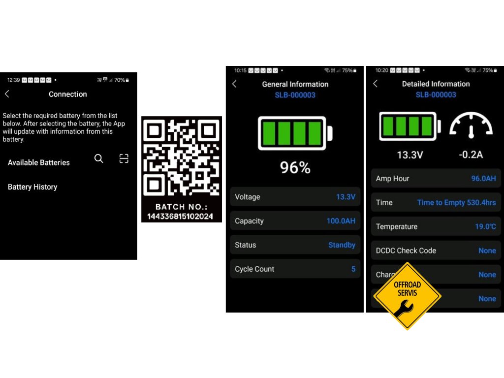 Pro připojení naskenujte QR kód (Na těle ARB Slimline baterie). Aplikace poskytuje souhrn klíčových informací o baterii a obrazovka detailní informace nabízí další podrobnosti, včetně času do prázdné či plně nabité baterie.