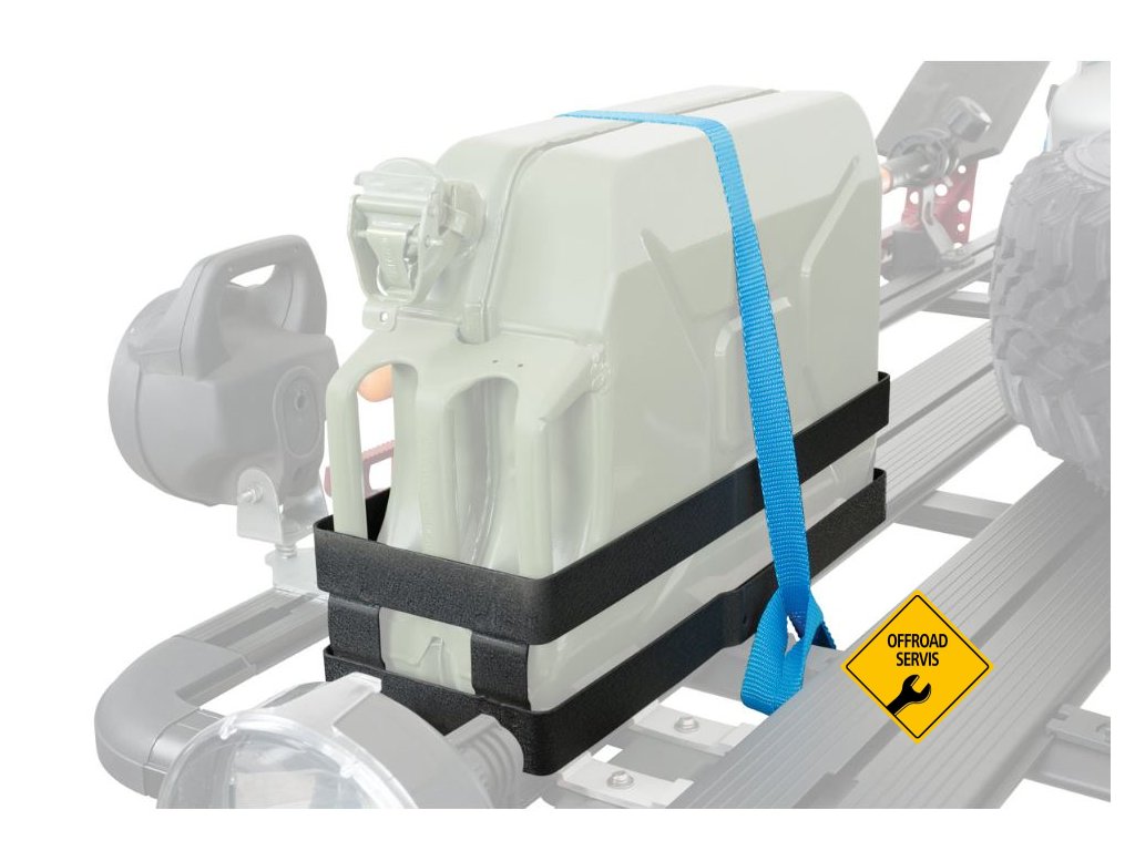 Horizontální držák kanystru na střešní plošinu. Kanystr nemusí zabírat místo v zavazadlovém prostoru, ale můžeme ho uklidit na střechu, kde ho bezpečně podrží tento držák. Navíc v případě převozu paliva nemusíme v interiéru řešit vůni benzínu či zápach nafty.