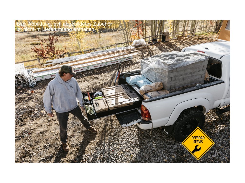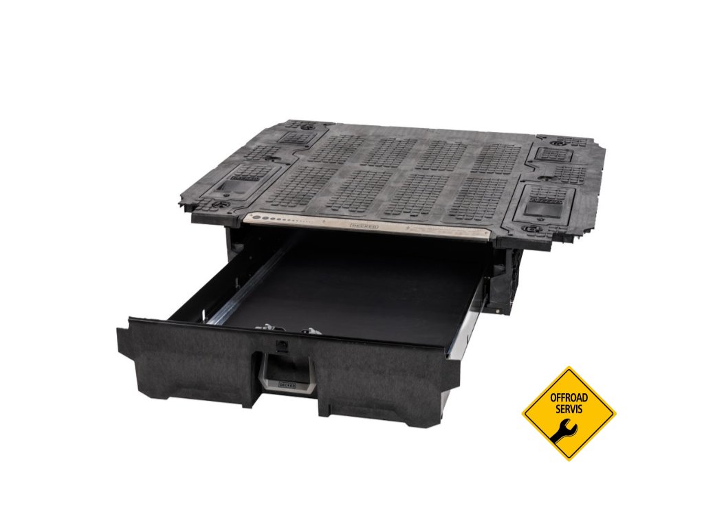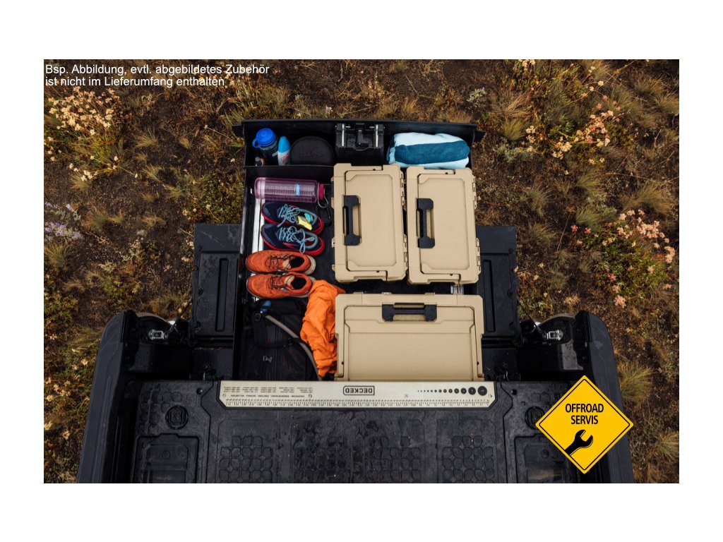 Středně velký systém zásuvek DECKED se vyznačuje vysoce všestrannou jednou zásuvkou s nosností 180 kg. Kombinuje odolnost vůči povětrnostním vlivům, uzamykatelnost (zámky je nutné objednat samostatně) a extrémně bezpečné možnosti úložného prostoru. S plošinou vybavenou D-kroužky a užitečným zatížením 454 kg nabízí bezprecedentní všestrannost použití.